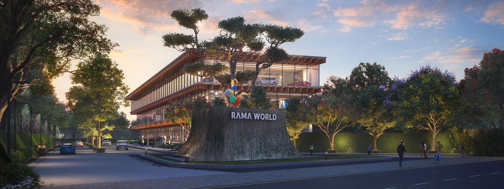 The Rama Display Building in Raipur presents a contemporary facade with a focus on transparency and lightness. Its rectilinear form is articulated by a rhythmic grid of exposed structural members, likely steel or composite, creating a strong visual order.