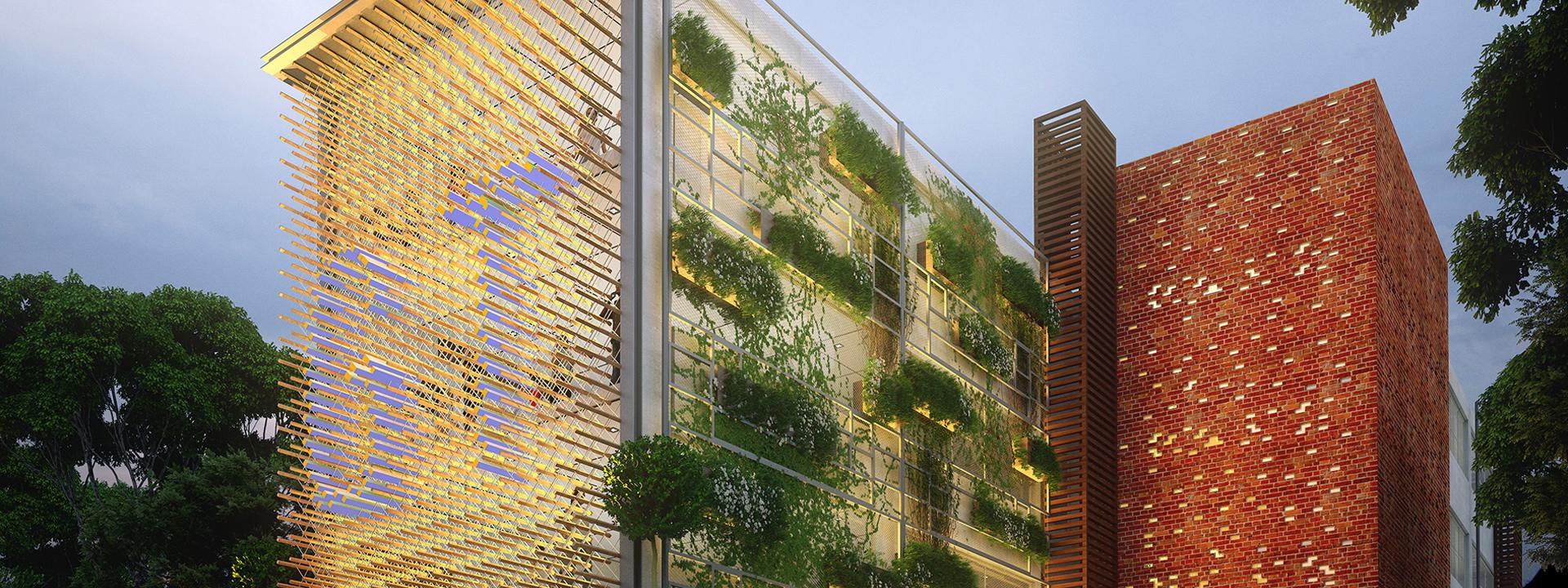 Other façade here are also made from glass and window in order to get proper light and ventilation through out the building, but along with that green screen of creepers and planters has also been created in order to filter the hard glare of light. The front façade of the office had been innovatively designed with timber member and cable system. It has been stretched along the building as well as a false floor height has been provided on the terrace in order to visually increase the scale of building.