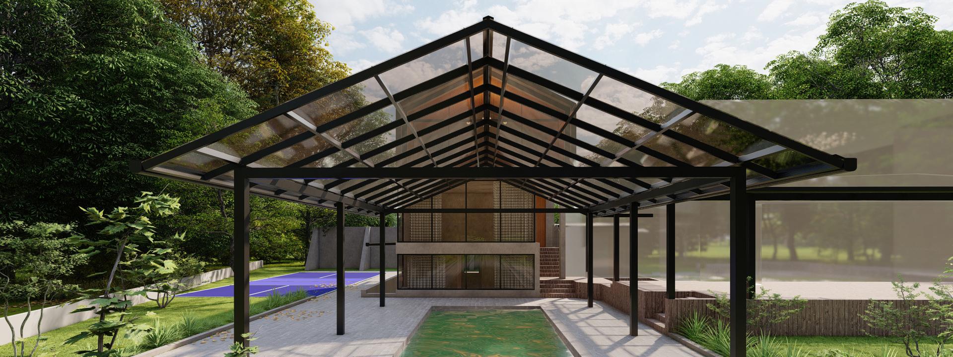 The Aamby Valley House is a contemporary retreat set within a lush green landscape, designed to harmonize with nature. Its elegant gable-roofed structure, large glass openings, and earthy materials create a seamless indoor-outdoor experience. The residence incorporates sustainable design elements, maximizing natural ventilation and daylight while ensuring energy efficiency. A key highlight is the covered outdoor space, featuring a transparent roof supported by slender steel columns, providing shelter while maintaining a visual connection to the surroundings. This architectural feature enhances the experience of outdoor living, making it an inviting and serene escape within nature.